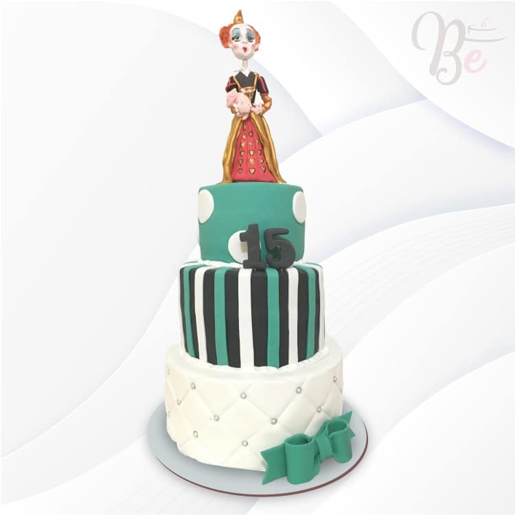 Este impresionante pastel de tres pisos está diseñado con esmero, presentando a la Reina de Corazones en fondant y detalles en cada capa que evocan el mágico mundo del cuento. Cada piso está cubierto en fondant para un acabado elegante y encantador.