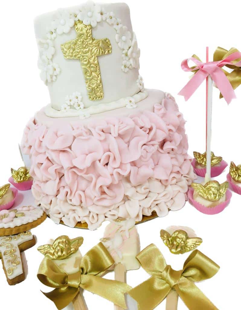 La Torta cruz dorada primera comunión, de dos pisos, destaca por su delicada decoración en tonos blanco y rosa, con un diseño de fondant que imita volantes en el piso inferior, y una cruz dorada en el piso superior, adornada con flores en relieve.