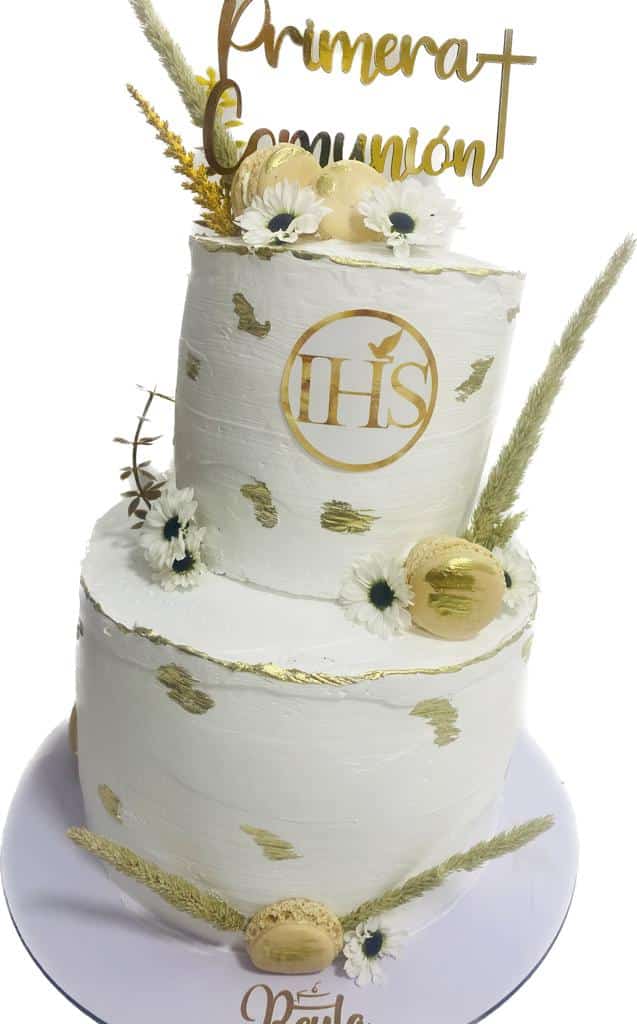 En la parte superior del pastel, un topper que dice “Primera Comunión” y el símbolo IHS resaltan el motivo religioso. Está adornada con flores blancas naturales y macarrones personalizados en tonos suaves que combinan con los elementos dorados, como espigas y detalles botánicos que aportan un toque rústico y natural.