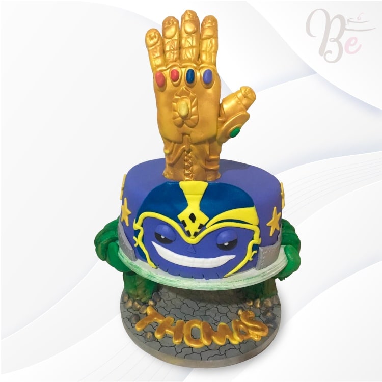 En la parte superior, destaca el icónico Guantelete del Infinito con las seis Gemas del Infinito, todo elaborado en fondant con detalles impresionantes. El diseño de la torta muestra el rostro de Thanos en la parte frontal, con su distintivo casco y colores característicos.